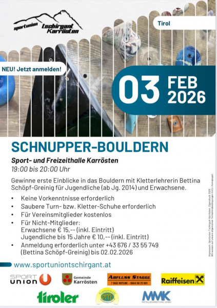| Ab DI 21.05. startet im Kletterzentrum Imst ein Anfängerkurs Klettern Erwachsene am Vormittag. Bei Interesse bitte gerne melden unter: info@inout.cc Liebe Grüße, Bettina | ![]() |